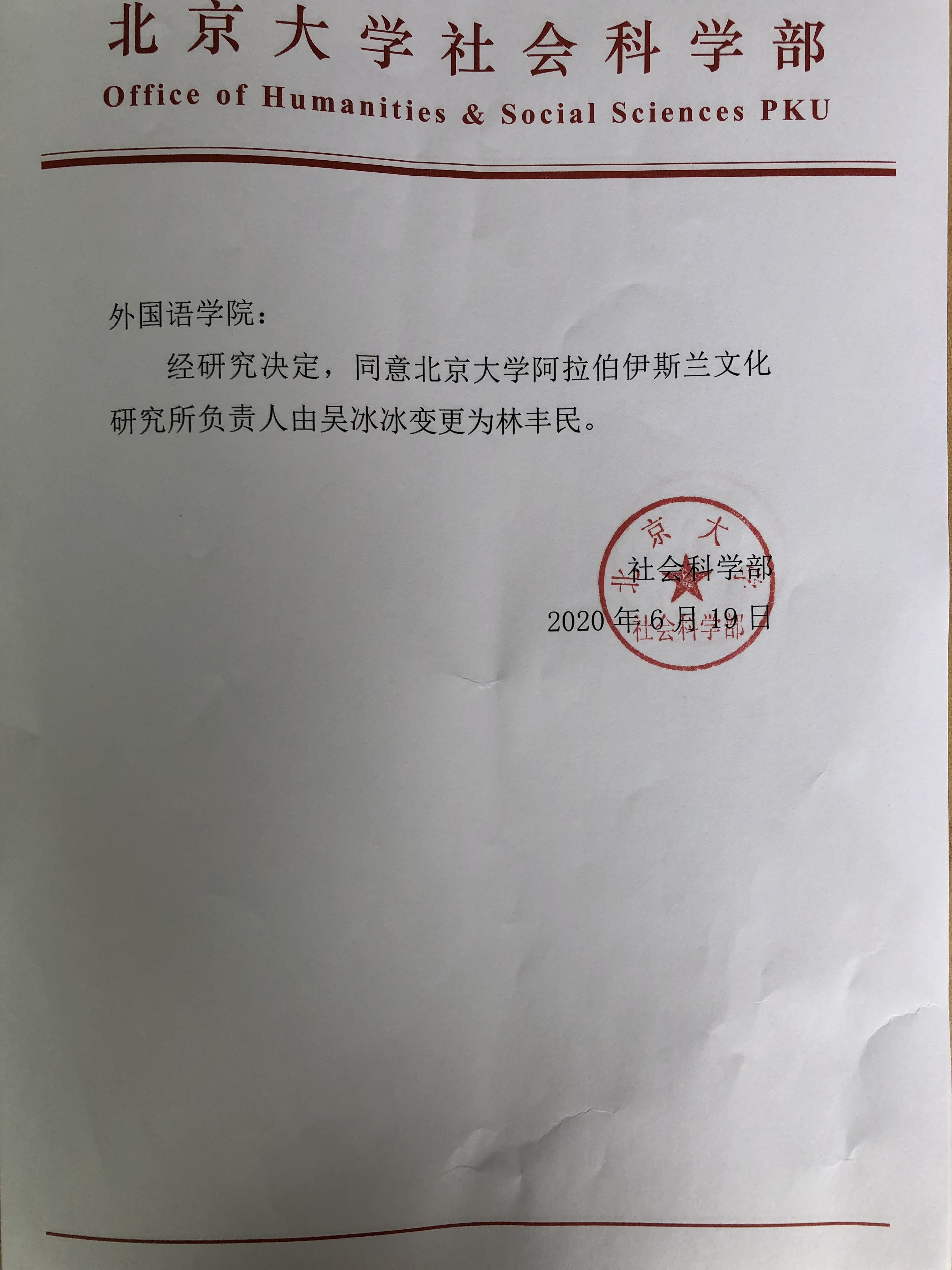 阿拉伯伊斯兰文化研究所负责人变更批件,负责人由付志明变更为林丰民,批准时间为2020年6月19日。