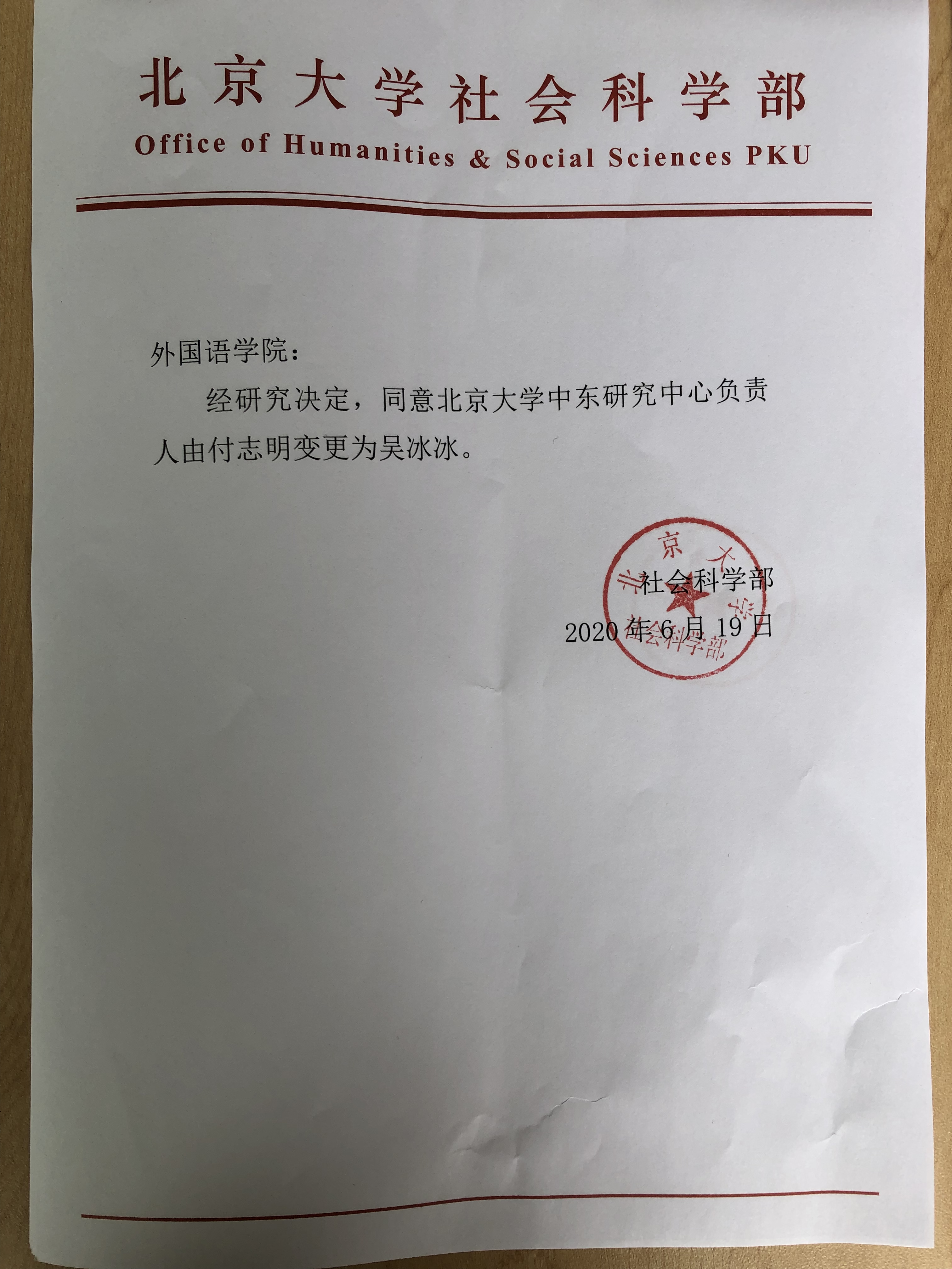 中东研究中心负责人变更批件,负责人由林丰民变更为吴冰冰,批准时间为2020年6月19日。