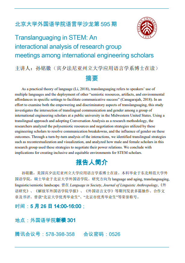 服务导航 广发在线平台语言学沙龙第595期:Translanguaging in STEM:An interactional analysis if research group meetings among international engineering scholars 2023-05-21