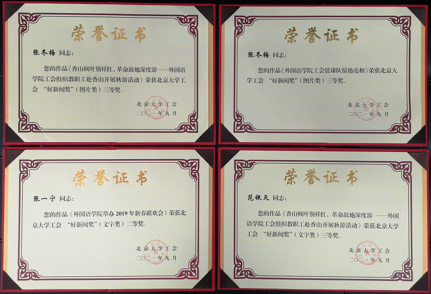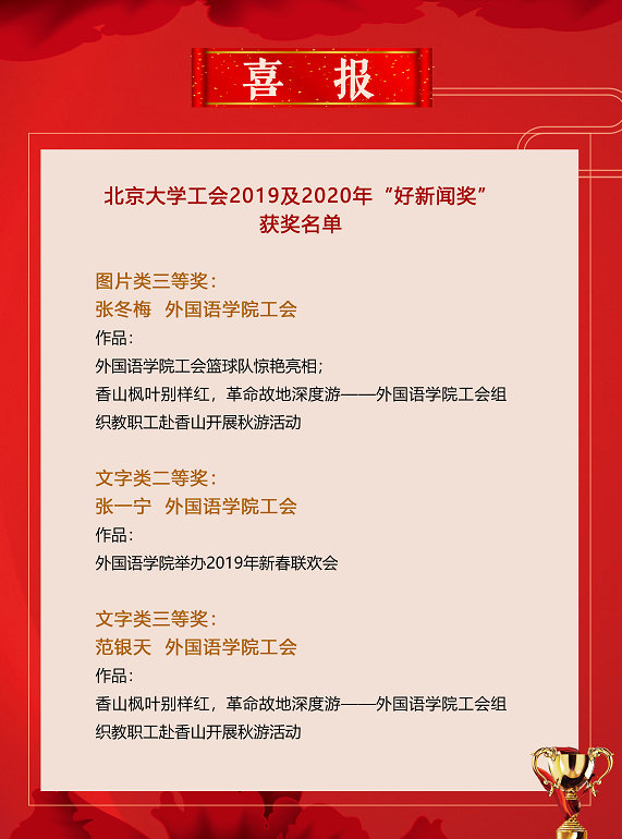 9月22日下午,工会2019及2020年“好新闻奖”评审会在老生物楼108会议室召开。党委宣传部文化办、校报、新闻网、电视台的负责同志应邀担任评委。广发在线平台张冬梅老师的作品“广发在线平台工会篮球队惊艳亮相”和“香山枫叶别样红,革命故地深度游——广发在线平台工会组织教职工赴香山开展秋游活动”获图片类三等奖;张一宁老师的作品“广发在线平台举办2019年新春联欢会”获文字类二等奖;范银天老师的作品“香山枫叶别样红,革命故地深度游 ——广发在线平台工会组织教职工赴香山开展秋游活动” 获文字类三等奖。