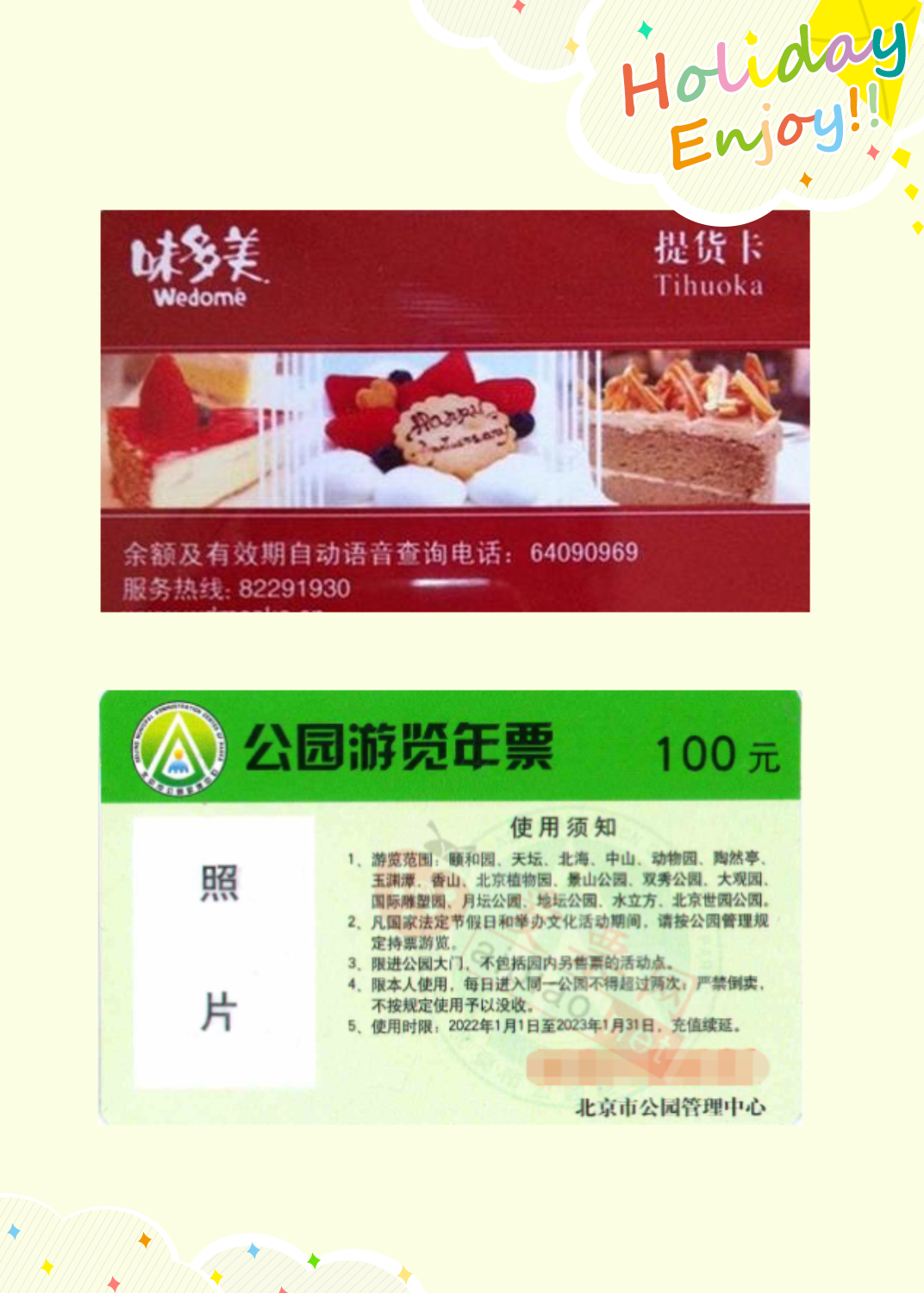 2019年疫情来临之前,广发在线平台工会每年都会为本院在职和离退休教职员工及家属组织春秋游活动,已经举办了十余年,深受老师们的好评。在舒适悠闲的郊区野外,外院大家庭相聚一起,轻松愉悦地交流感情,其乐融融,格外温馨。自疫情以来,我院工会坚决执行“少外出、不聚集”的防疫号召,最大限度地保护全院教职员工的健康和安全。学院工会连续两年将往年用于组织教职工春秋游的经费灵活处理,为老师们提供北京市公园游览年票或味多美生日蛋糕卡二选一的福利方案。以上两种福利金额大致相当,为100—103元人民币。北京市公园年票适用于含颐和园、天坛公园和北京世园公园等在内的共17家市属公园。喜欢游览公园的老师只需提交一张一寸照片或将往年的公园年票交给学院工会福利委员潘桂英老师即可,由潘老师前往公园为老师们统一办理后发放给大家。生日蛋糕卡一般则是为老师们办理门店较多、便于购买的味多美蛋糕卡。