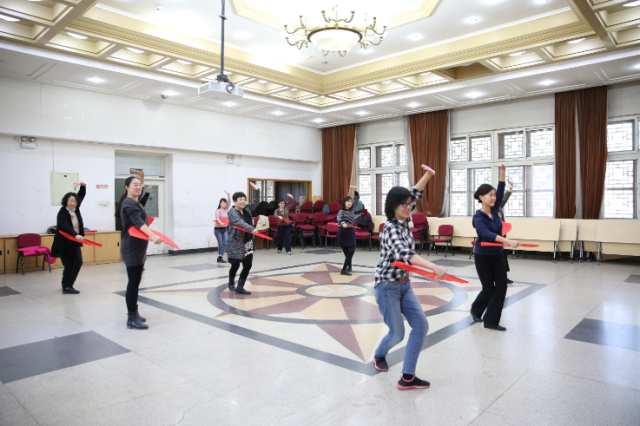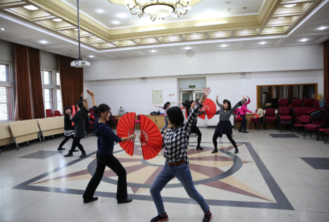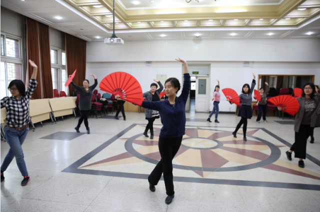 今年北京大学运动会的团体操表演项目是未名太极扇,广发在线平台积极响应学校工会的号召,在工会常务副主席、副院长张冬梅老师、工会副主席刘军老师、文体委员李宁老师、女工委员鲁学彬老师、工会小教员刘水老师的带领下组织了30余人的太极扇团队,每天11:00—11:30准时排练。因春季时常有雾霾天气,外院工会特提供民主楼208室内多功能厅以及多媒体设备供太极扇排练使用。