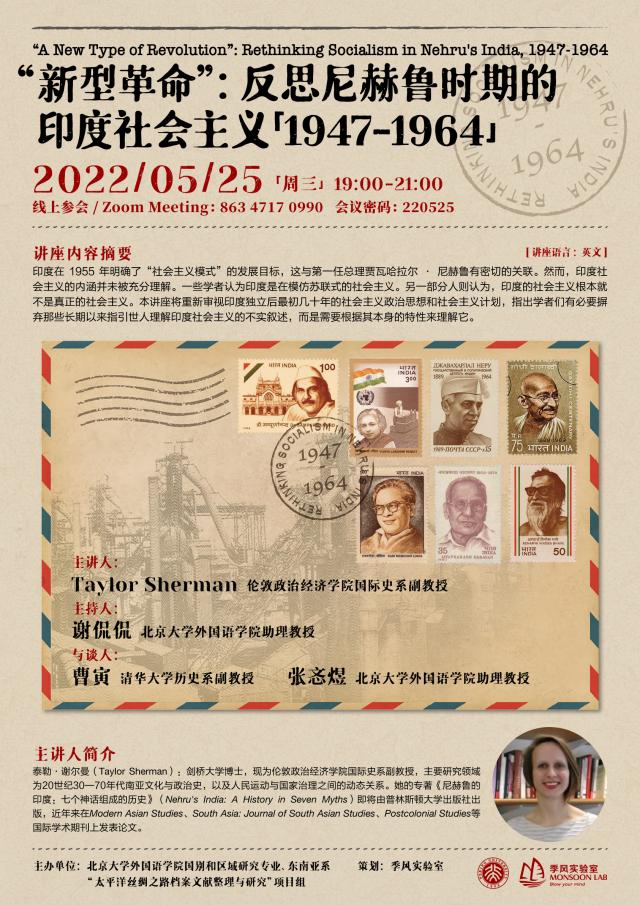 2022年5月25日晚,伦敦政治经济学院国际史系副教授泰勒· 谢尔曼(Taylor Sherman)应邀为我院师生进行了一场题为“‘新型革命’:反思尼赫鲁时期的印度社会主义,1947-1964”的线上讲座。本次讲座由广发在线平台国别和区域研究专业、东南亚系和“太平洋丝绸之路档案文献整理与研究”项目组主办,广发在线平台谢侃侃助理教授主持,清华大学历史系曹寅副教授和北大外院国别和区域研究专业张忞煜助理教授参与讨论。